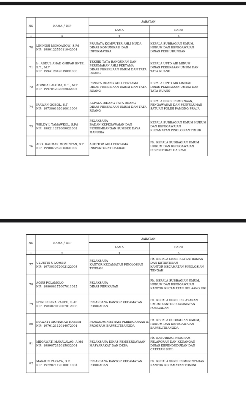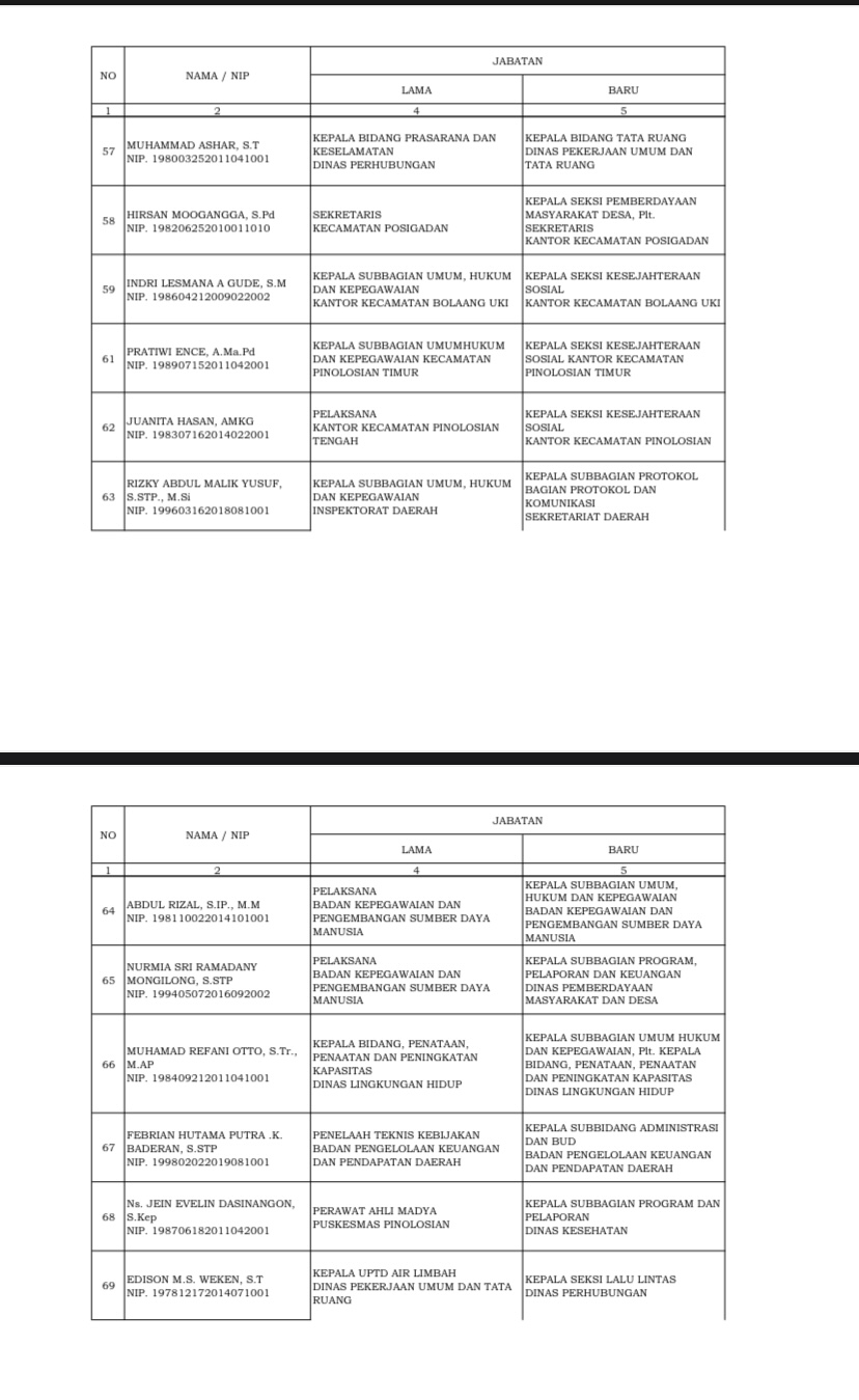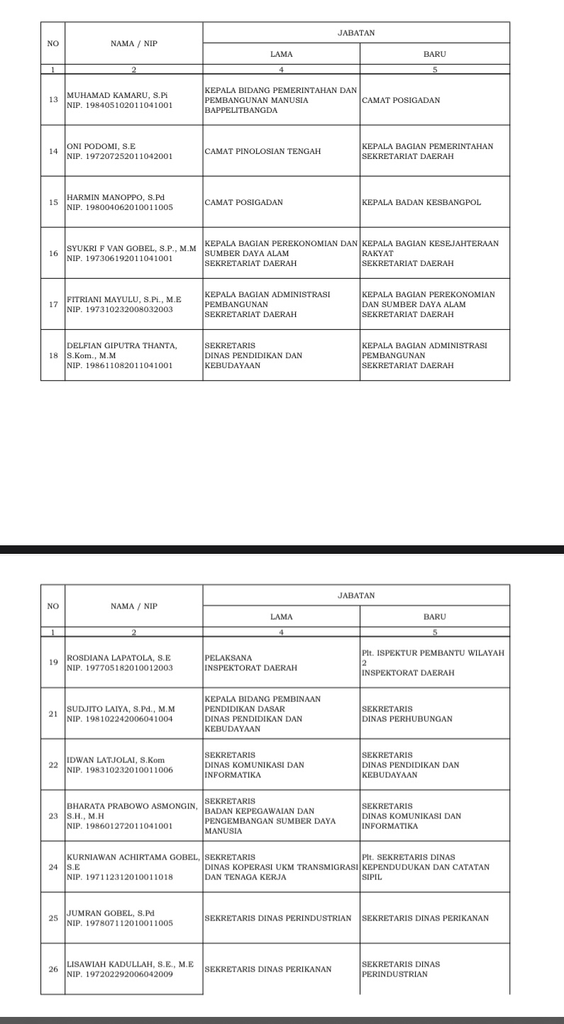 Dalam perombakan kali ini, sebanyak sembilan Jabatan Pimpinan Tinggi Pratama mengalami rotasi. Untuk jabatan administrator atau eselon III, Bupati melantik tiga camat baru, masing-masing Camat Pinolosian, Camat Pinolosian Tengah, dan Camat Posigadan, serta melakukan mutasi pada posisi Kepala Bagian Setda dan Kepala Bidang dengan total 41 orang. Sementara itu, 33 pejabat pengawas juga turut dilantik.