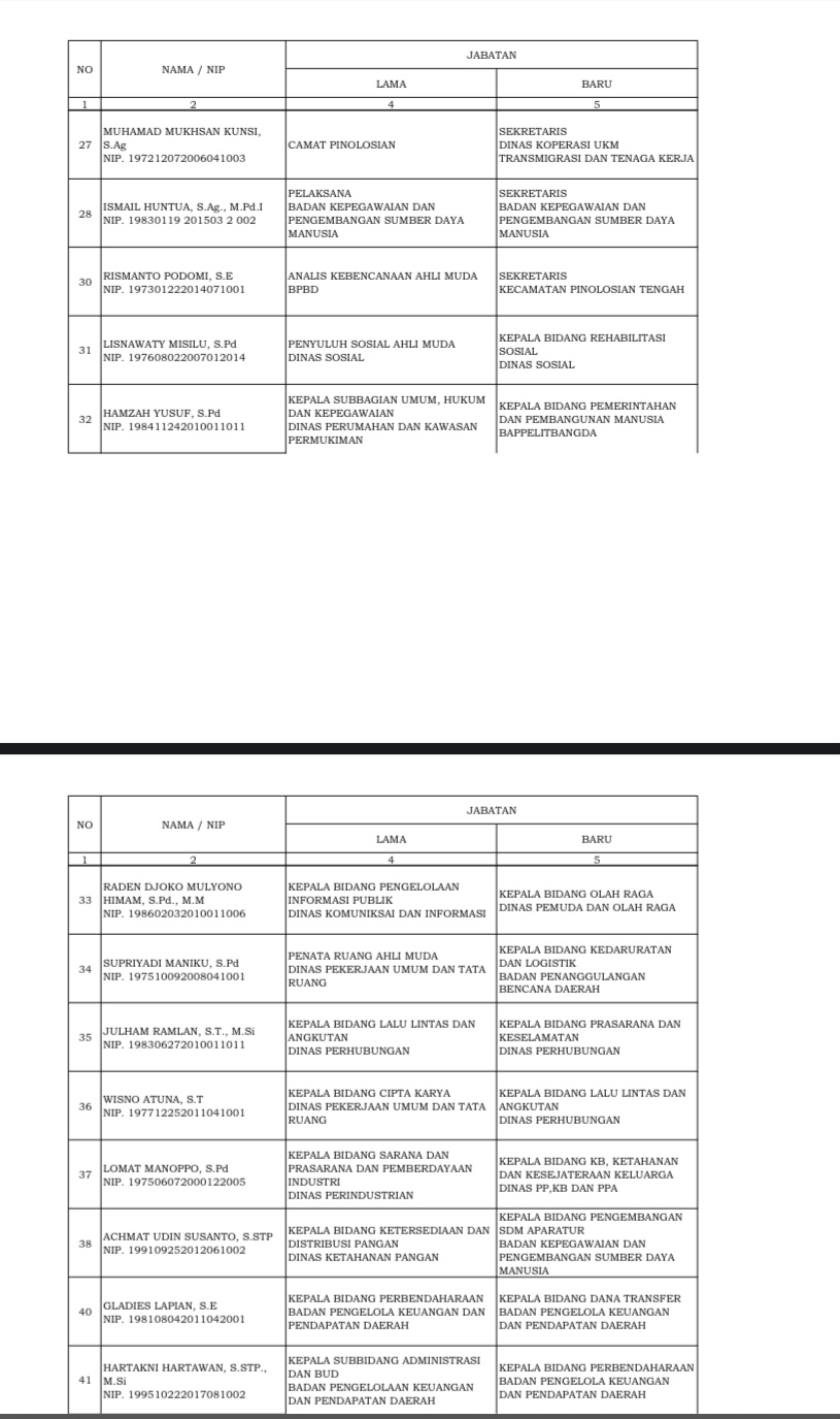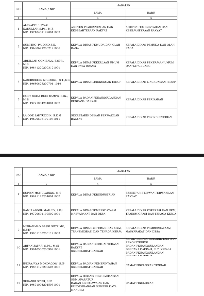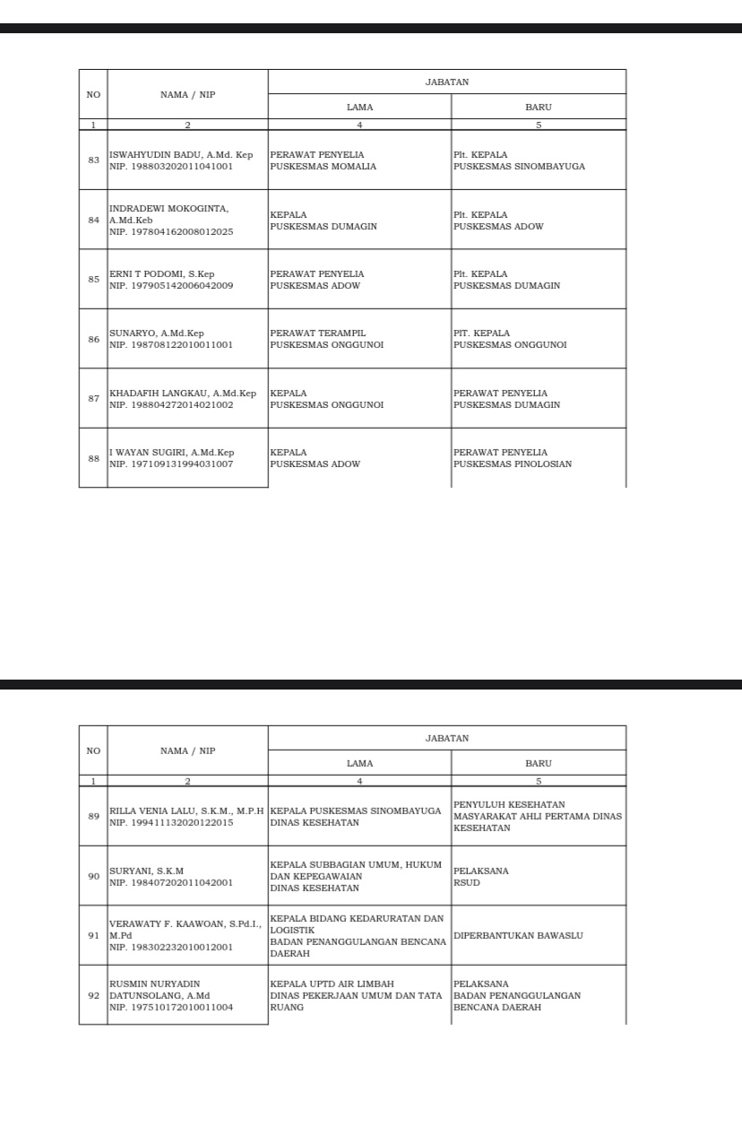 Dalam perombakan kali ini, sebanyak sembilan Jabatan Pimpinan Tinggi Pratama mengalami rotasi. Untuk jabatan administrator atau eselon III, Bupati melantik tiga camat baru, masing-masing Camat Pinolosian, Camat Pinolosian Tengah, dan Camat Posigadan, serta melakukan mutasi pada posisi Kepala Bagian Setda dan Kepala Bidang dengan total 41 orang. Sementara itu, 33 pejabat pengawas juga turut dilantik.