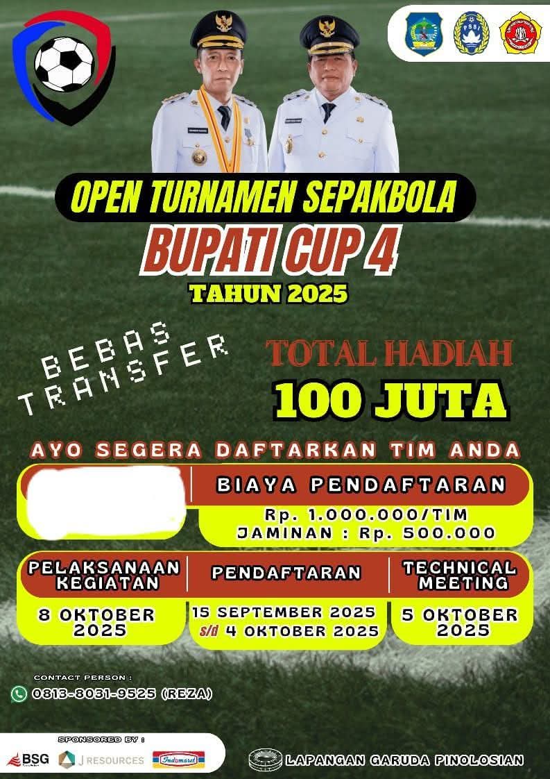 Turnamen Bupati Cup 4 rencananya akan resmi dibuka pada 8 Oktober 2025 di Lapangan Garuda, Desa Pinolosian. Sebanyak 36 tim dipastikan ikut ambil bagian untuk memperebutkan gelar juara dalam ajang sepak bola bergengsi tersebut.