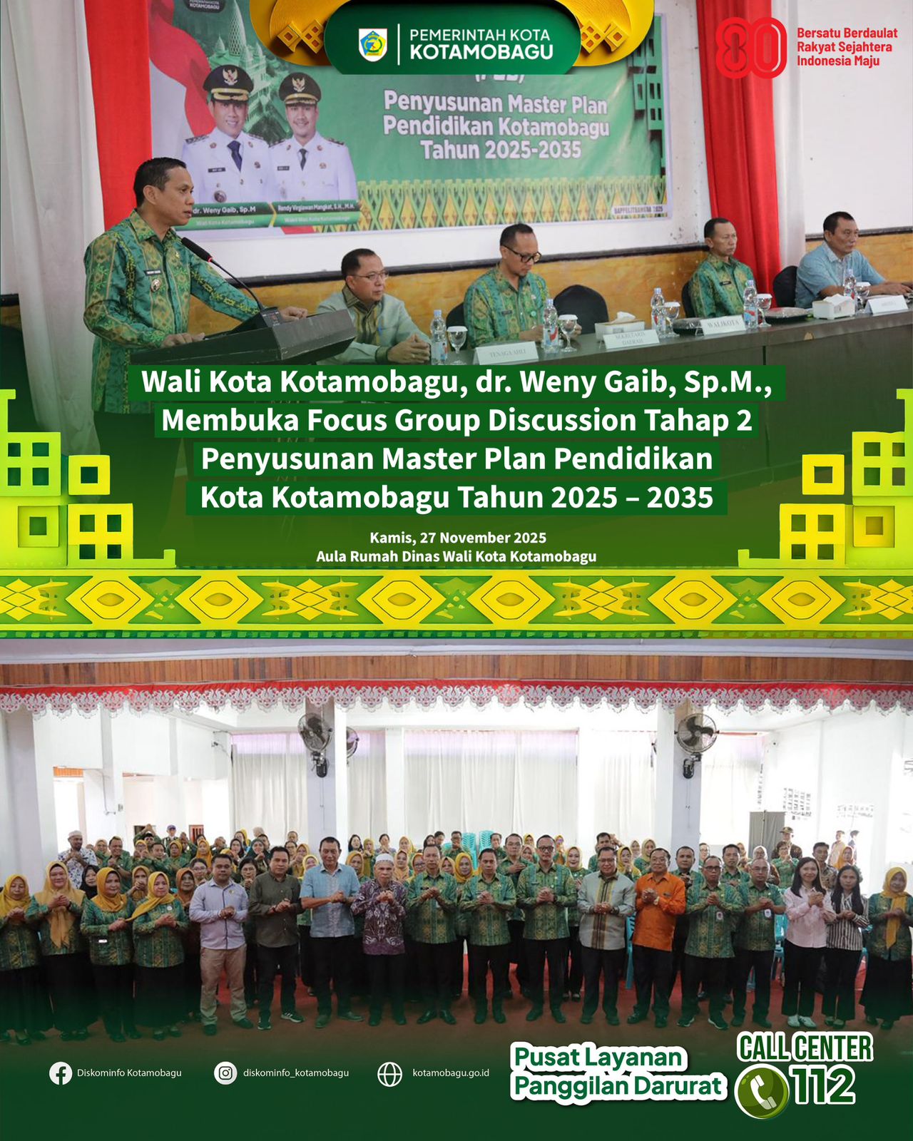 Kotamobagu — Wali Kota Kotamobagu, dr. Weny Gaib, Sp.M., resmi membuka pelaksanaan Focus Group Discussion (FGD) Tahap II Penyusunan Master Plan Pendidikan Kota Kotamobagu Tahun 2025–2035, yang digelar di Aula Rumah Dinas Wali Kota Kotamobagu, Kamis (27/11).