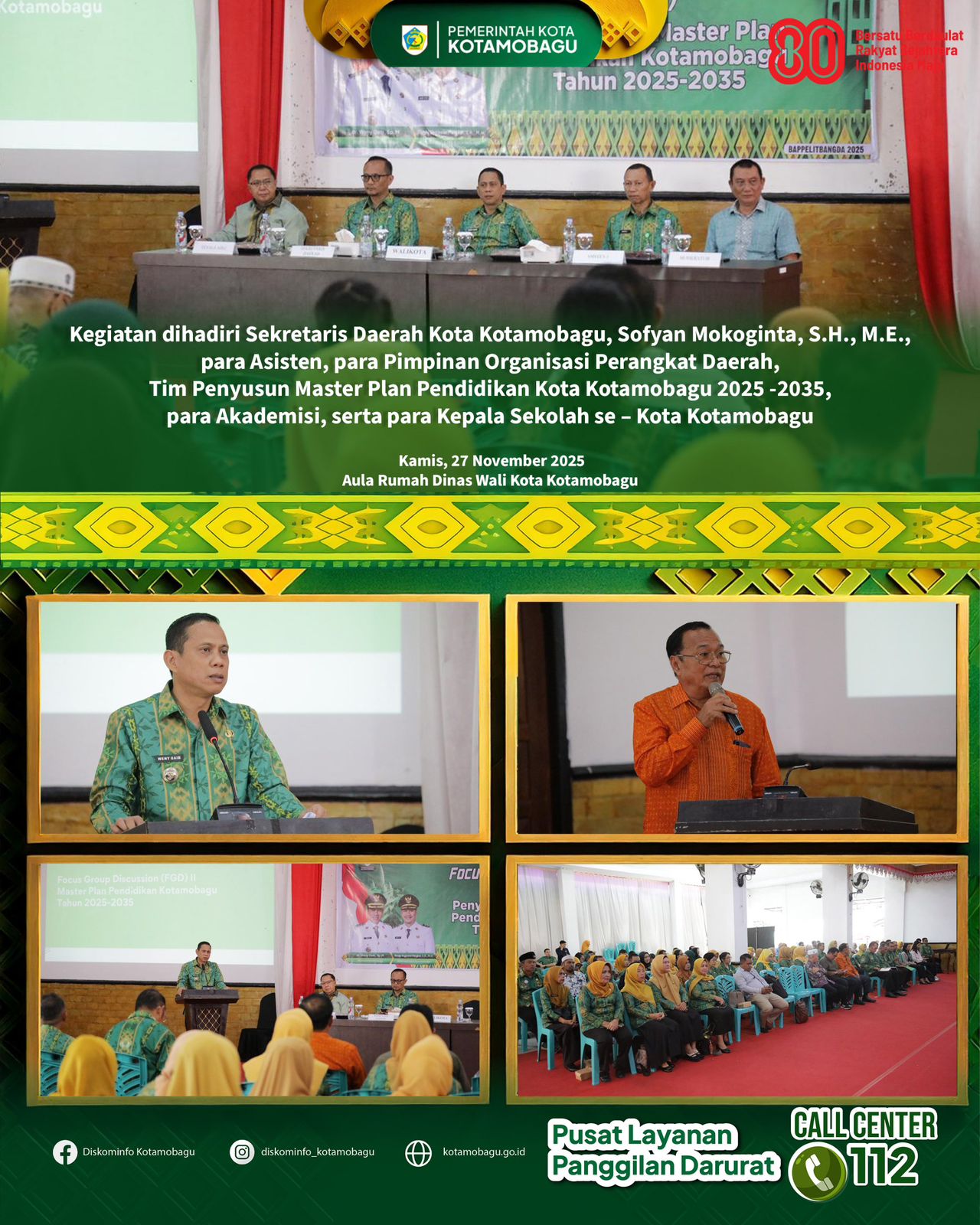 Turut hadir dalam kegiatan tersebut, Sekretaris Daerah Kota Kotamobagu Sofyan Mokoginta, S.H., M.E., para Asisten, para Pimpinan Organisasi Perangkat Daerah, Tim Penyusun Master Plan Pendidikan 2025–2035, para akademisi, serta para kepala sekolah se-Kota Kotamobagu.