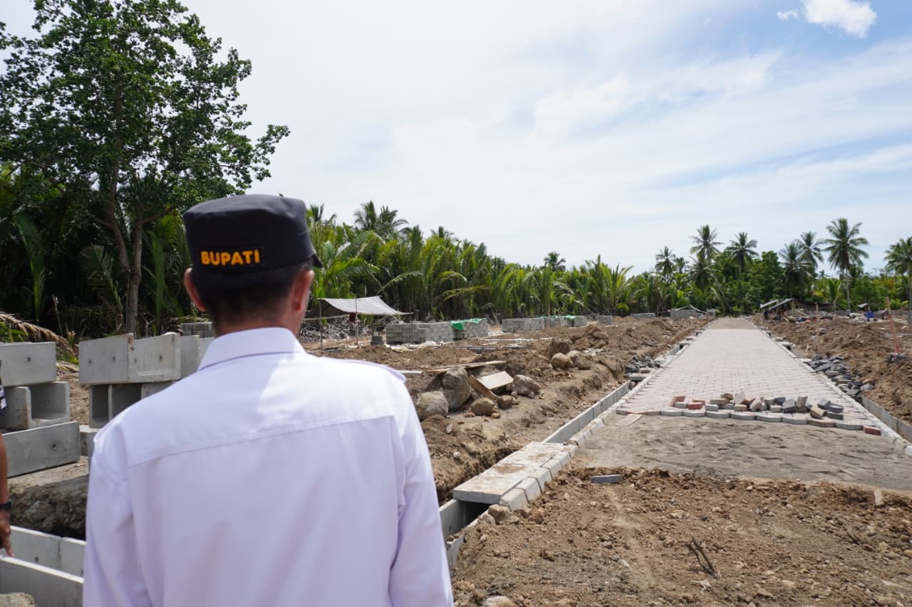 Dalam peninjauan tersebut, Bupati Iskandar melihat secara langsung progres pekerjaan yang meliputi pembangunan perumahan, penyediaan air bersih, pembuatan drainase, jalan paving, hingga kelengkapan material di lapangan.